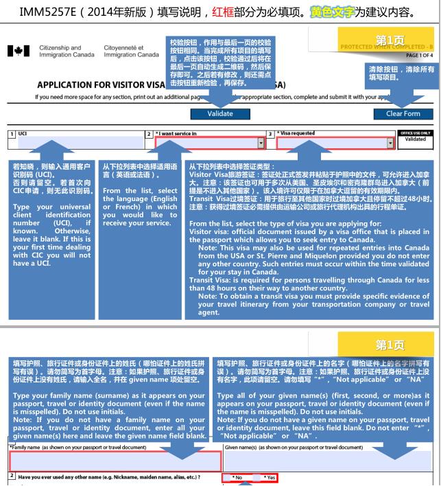 鉴于有关加拿大签证申请表IMM5257E表格的中文资料甚少,基于此前成功签证的经验,结合CIC官方指南材料,本中心制作了以下加拿大旅游签证申请表填写样本(IMM5257E)表格的中英文双语对照详注,仅供参考。